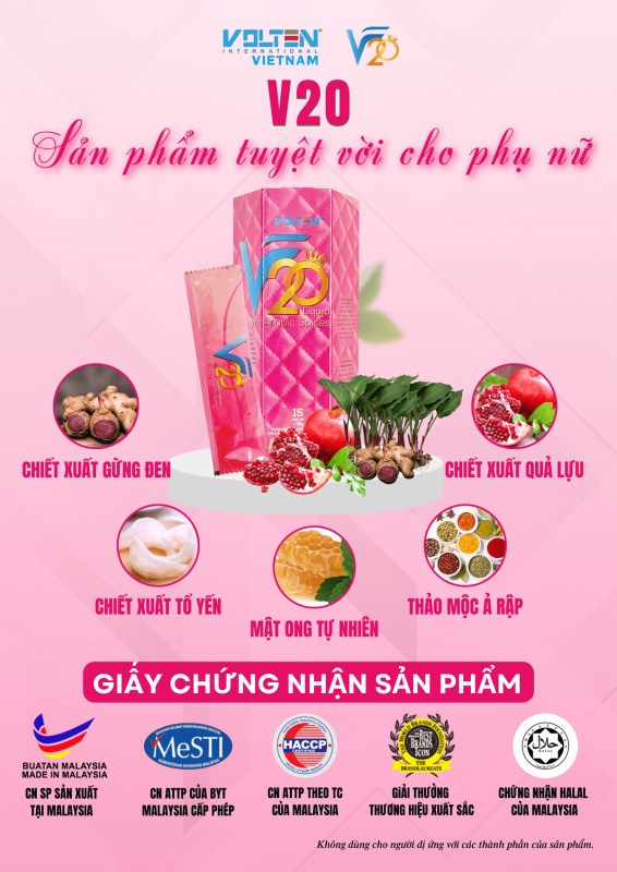 Điểm nhấn của sản phẩm nằm ở thảo dược Ả Rập, vốn được gìn giữ trong văn hóa truyền thống như món quà thiên nhiên giúp nâng cao thể và hỗ trợ cân bằng. Khi kết hợp cùng lựu đỏ giàu chất chống oxy hóa, V20 Liquid trở thành lựa chọn tinh tế, đồng hành cùng phái đẹp trong hành trình nuôi dưỡng sự rạng rỡ và tự tin từ bên trong.